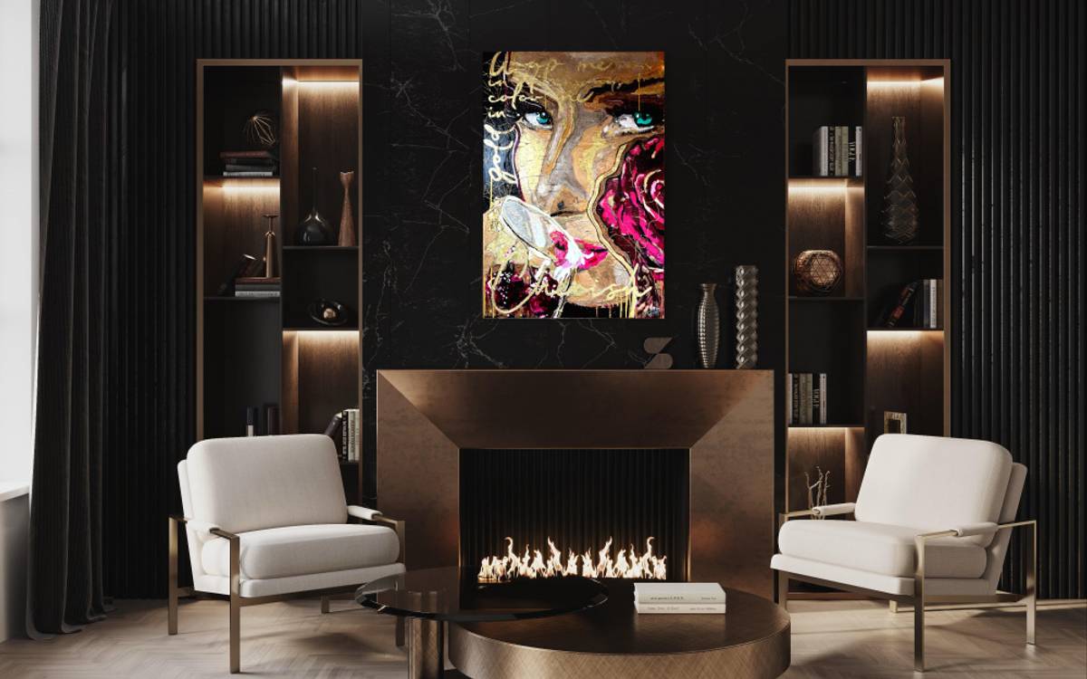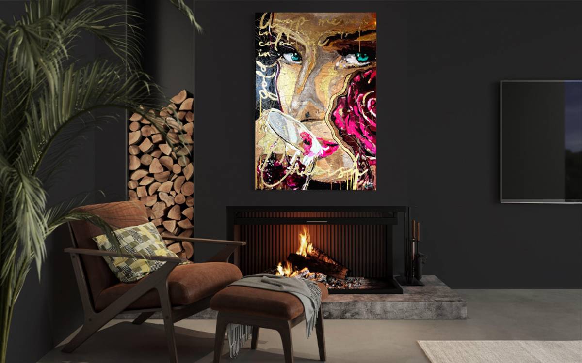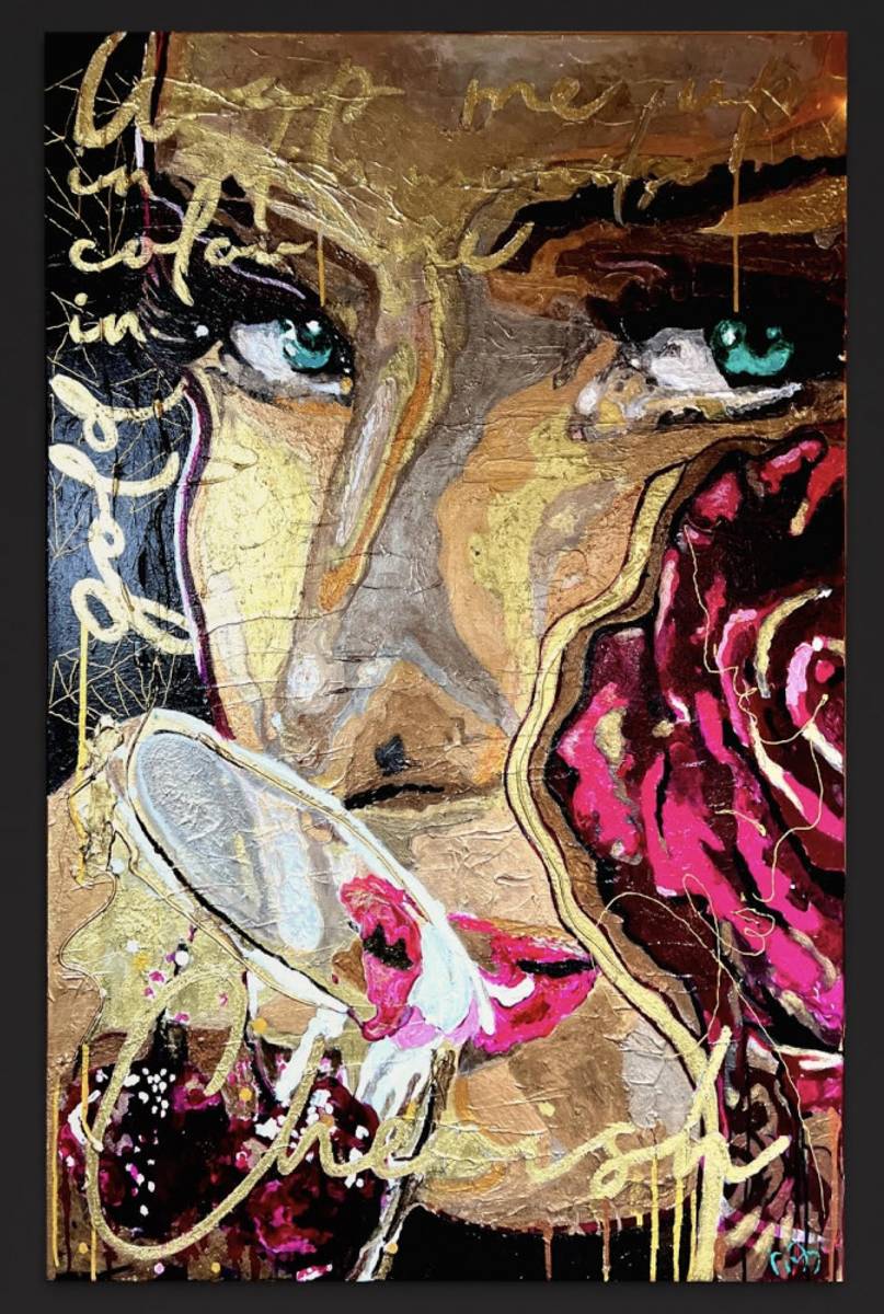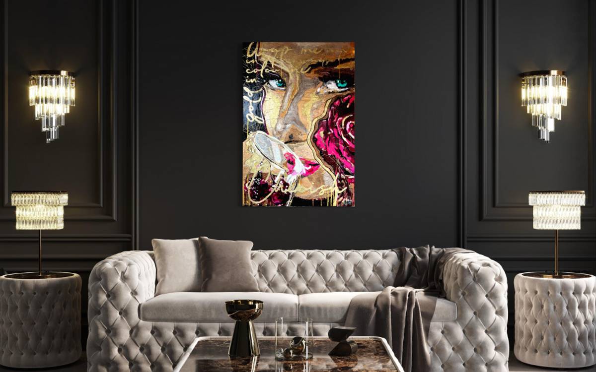 Blikket til kvinnen er bildets blikkfang, der øynene uttrykker lengsel, savn og lidenskap. Tekst og elementer i bildet peker på hennes innerste ønsker: «Wrap me up in diamonds, color me in gold» er ikke et ønske om å få diamanter og gull, men en metafor på å bli rik av den ekte kjærlighet. Kvinnen vet sin verdi, og velger kun det beste. Hun ønsker å fange den enes øyne, og bli verdsatt som en verdifull diamant, noe diamantene på siden viser. Rosen og lineart, av en mann som kjærlig holder rundt sin kvinne, understreker hennes ønske om å få leve ut sin kjærlighet med mannen hun alltid vil elske.. Kirsebær -cherries - er i hennes vinglass, og symboliserer et ønske om at kjærligheten skal bli ekte vist og verdsatt, gitt og mottatt. Hun vil drikke av livets søteste vin, og leve beruset av kjærlighet.