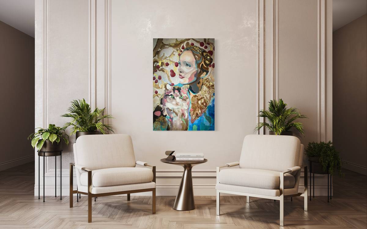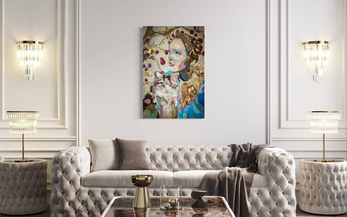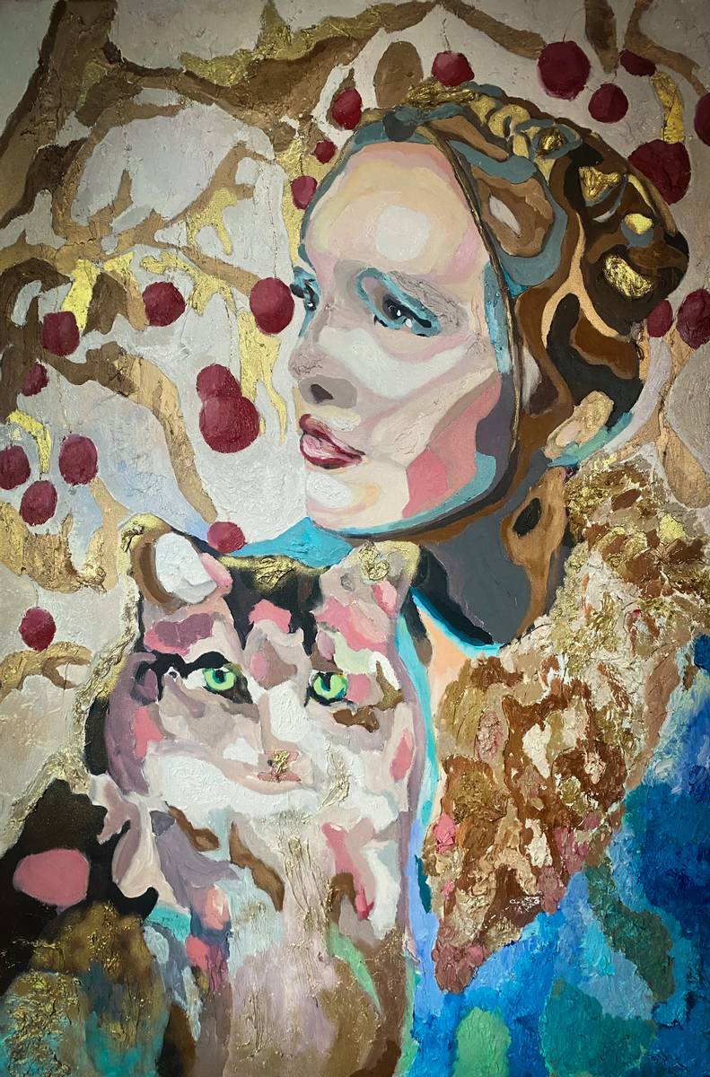 opplevde og barndommens minner. Kattens blikk er rettet mot publikum som understreker at livet er her og nå. Jenta er omringet av gulltrær med rød frukter. Dette viser til ungdommens blomstring, men også til livets fremtidige gaver. Gull symboliserer rikdom, og røde frukt -frukt av kjærlighet. Klar